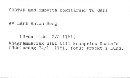 GUSTAF med ombytta bokstäfwer Tu Gafs Av Lars Anton Borg //// Lärda tidn. 2/2 1761. //// Anagrammatisk dikt till kronprins Gustafs födelsedag 24/1 1761, förut tryckt i Lund.