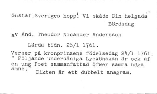 Gustaf,Sveriges hopp' Vi skåde Din helgala //// Bördsdag //// av And. Theodor Nicander Andersson Lärda tidn. 26/1 1761. //// Verser på kronprinsens födelsedag 24/1 1761. " Följande underdåniga Lyckönskan är ock af en ung Poet sammanfattad öfwer samma höga //// ämne." //// Dikten är ett dubbelt anagram.