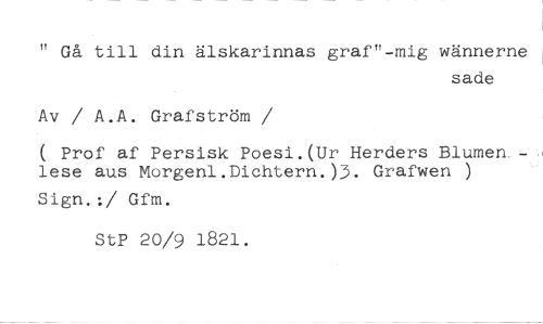 " Gå till din älskarinnas graf"-mig wännerne //// sade //// Av / A.A. Grafström //// /( Prof af Persisk Poesi.(Ur Herders lese aus Morgenl.Dichtern.)3. Grafwen ) //// Sign.:/ Gfm. //// StP 20/9 1821.