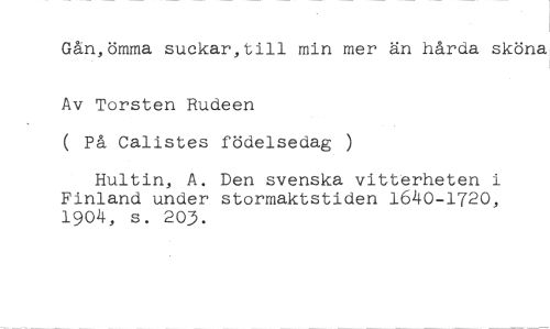 Gän,ömma suekar,till min mer än hårda sköna //// Av Torsten Rudeen //// ( På Calistes födelsedag ) //// Hultin, A. Den svenska vitterheten i Finland under stormaktstiden 1640-1720, 1904, s. 203.
