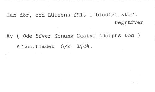 Han dör, och LUtzens fält i blodigt stoft //// begrafver //// Av ( Ode öfver Konung Gustaf Adolphs Död ) Afton.bladet 6/2 1784.