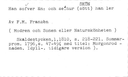 V SKÖN //// Han sofver än: och se!hur (sött) han ler //// Av F.M. Franzén //// ( Modren och Sonen eller Naturskönheten ) //// Skaldestycken,1,1810, s. 218-221. Sommarprom. 1796,s. 47-49( med titel: Morgonrod - naden. Idyll-. tidigare version ).