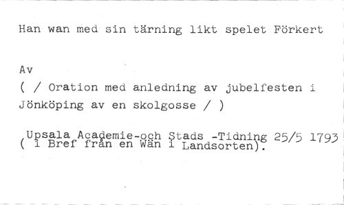 Han wan med sin tärning likt spelet Förkert //// Av //// ( / Oration med anledning av jubelfesten i Jönköping av en skolgosse / ) //// Upsala Acalgemie-oh stads -Tidning 25/5 1793 ( i Bref från en Wan i Landsorten).