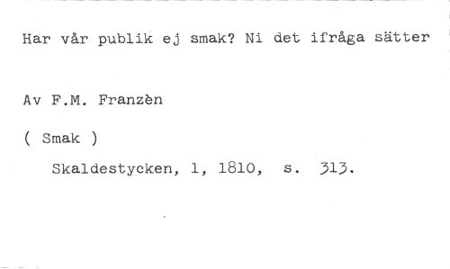 Har vår publik ej smak? Ni det ifråga sätter //// Av F.M. Franzén //// ( Smak ) //// Skaldestycken, 1, 1810, s. 313.
