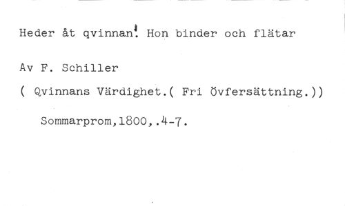 Heder åt qvinnan! Hon binder och flätar //// Av F. Schiller //// ( Qvinnans Värdighet.( Fri Övfersättning.)) //// Sommarprom,1800,.4-7.