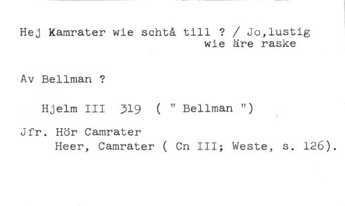 Hej kamrater wie schtå till ? / Jo,lustig //// wie äre raske //// Av Bellman ? //// Hjelm III 319 ( " Bellman ") //// Jfr. Hör Camrater //// Heer, Camrater ( Cn III; Weste, s. 126).