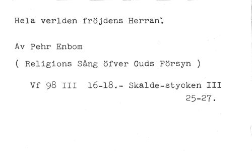Hela verlden fröjdens Herran: //// Av Pehr Enbom //// ( Religions Sång öfver Guds Försyn ) //// Vf 98 III 16-18.- Skalde-stycken III //// 25-27.
