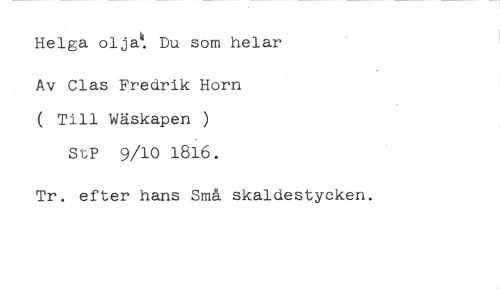 Helga oljah. Du som helar //// Av Clas Fredrik Horn ( Till Wäskapen ) StP 9/lo 1816. //// Tr. efter hans Små skaldestycken.