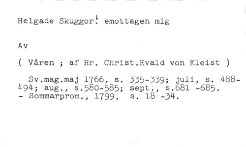 Helgade Skuggor!' emottagen mig //// Av //// ( Våren ; af Hr. Christ.Evald von Kleist ) //// Sv.mag.maj 1766, s. 335-339; juli, s. 488494; aug., s.580-585; sept., s.681 -685. Sommarprom., 1799, s. 18 -34.