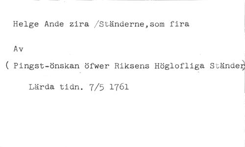 Helge Ande zira /Ständerne,som fira //// Av //// ( Pingst-önskan öfwer Riksens Höglofliga Stände?; //// Lärda tidn. 7/5 1761