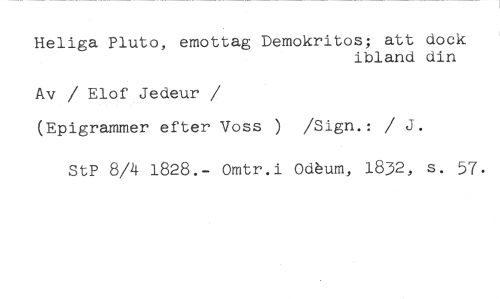 Heliga Pluto, emottag Demokritos; att dock //// ibland din //// Av / Elof Jedeur //// /(Epigrammer efter Voss ) /Sign.: / J. //// StP 8/4 1828.- Omtr.i Odhum, 1832, s. 57.