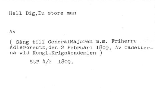 Hell Dig,Du store man //// Av //// ( Sång till GeneralMajoren m.m. Friherre //// Adlercreutz,den 2 Februari 1809, Av Cadetterna wid Kongl.KrigsAcademien ) //// StP 4/2 1809.