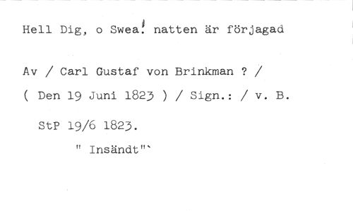 Hell Dig, o Swea! natten är förjagad //// Av / Carl Gustaf von Brinkman ? //// /( Den 19 Juni 1823 ) / Sign.: / v. B. //// StP 19/6 1823. //// II Insändt"'