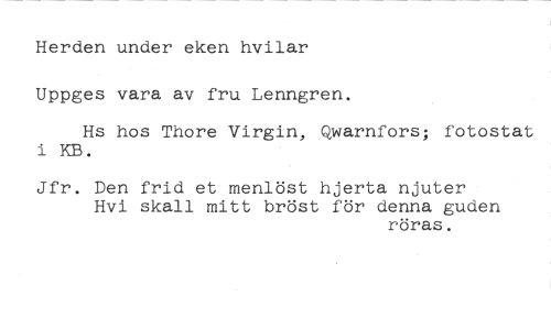 Herden under eken hyllar Uppges vara av fru Lenngren. //// Hs hos Thore Virgin, Qwarnfors; fotostat i KB. //// Jfr. Den frid et menlöst hjerta njuter Hvi skall mitt bröst för denna guden //// röras.