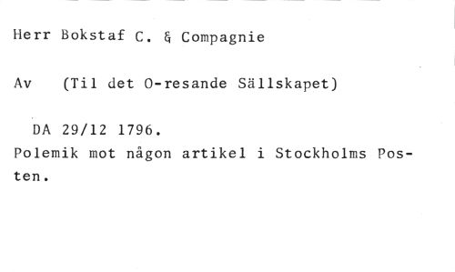 Herr Bokstaf C. E Compagnie //// Av (Til det 0-resande Sällskapet) //// DA 29/12 1796. //// Polemik mot någon artikel i Stockholms Posten.