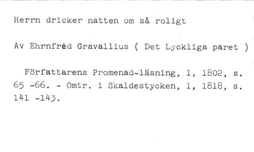 Herrn dricker natten om så roligt //// Av Ehrnfråd Gravallius ( Det Lyckliga paret ) //// Författarens Promenad-läsning, 1, 1802, s. 65 -66. - Omtr. i Skaldestycken, 1, 1818, s. 141 -143.