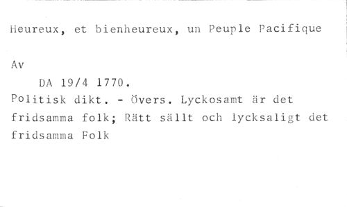 Heureux, et bienheureux, un Peuple Pacifique //// Av //// DA 19/4 1770. //// Politisk dikt. - övers. Lyckosamt är det fridsamma folk; Rätt sällt och lycksaligt det fridsamma Folk