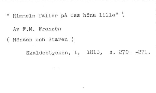 " Himmeln faller på oss höna lilla" t //// Av F.M. Franzén //// ( Hönsen och Staren //// Skaldestycken, 1, 1810, s. 270 -271.