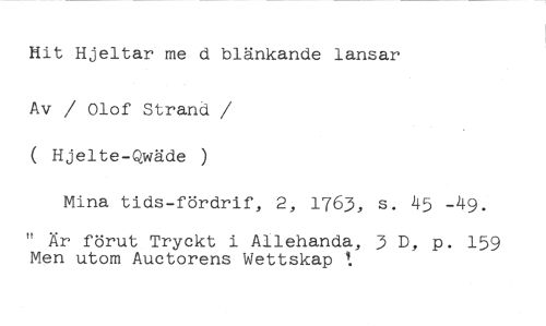 Hit Hjeltar me d blänkande lansar //// Av / Olof Strand / ( Hjelte-Qwäde ) //// Mina tids-fördrif, 2, 1763, s. 45 -49. //// " Är förut Tryckt i Allehanda, 3 D, p. 159 Men utom Auctorens Wettskap I