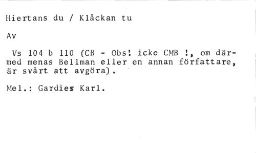 Hiertans du / Klåckan tu Av //// Vs 104 b 110 (CB - Obs! icke CMB om där- //// med menas Bellman eller en annan författare, är svårt att avgöra). //// Mel.: Gardies Karl.