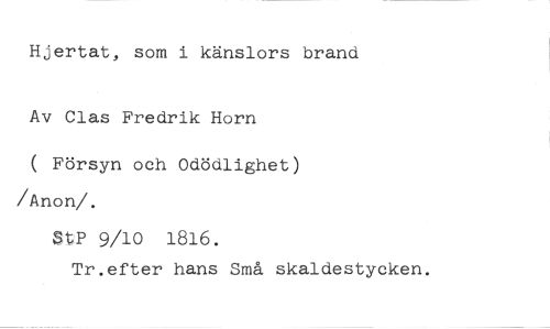 Hjertat, som i känslors brand Av Clas Fredrik Horn //// ( Försyn och Odödlighet) /Anon/. //// StP 9/10 1816. //// Tr.efter hans Små skaldestycken.