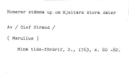 Homerer stämma up om Hjeltars stora dater //// Av / Olof Strand / ( Marullus ) //// Mina tids-fördrif, 2., 1 763, s. 80 -82.