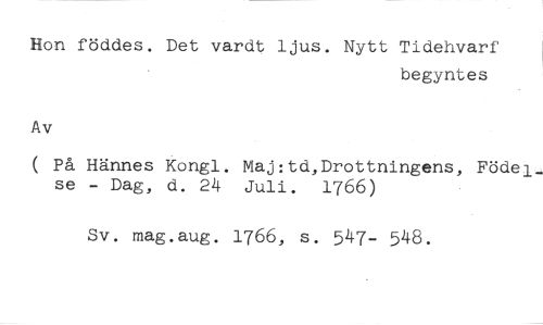 Hon föddes. Det vardt ljus. Nytt Tidehvarf //// begyntes //// Av //// På Rännes Kongl. Maj:td,Drottningens, Födel_ se - Dag, d. 24 Juli. 1766) //// Sv. mag.aug. 1766, s. 547- 548.