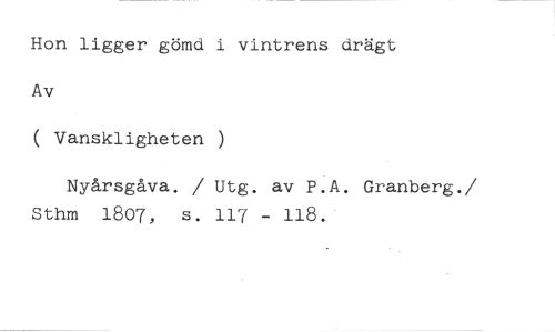 Hon ligger gömd i vintrens drägt Av //// ( Vanskligheten ) //// Nyårsgåva. / Utg. av P.A. Granberg./ Sthm 1807, s. 117 - 118.