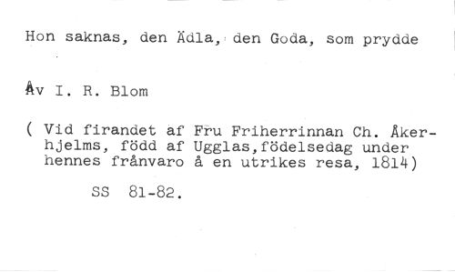 Hon saknas, den Ädla, ,den Goda, som prydde Av 1. R. Blom //// Vid firandet af Fru Friherrinnan Ch. Åkerhjeims, född af Ugglas,födelsedag under hennes frånvaro å en utrikes resa, 1814) //// ss 81-82.
