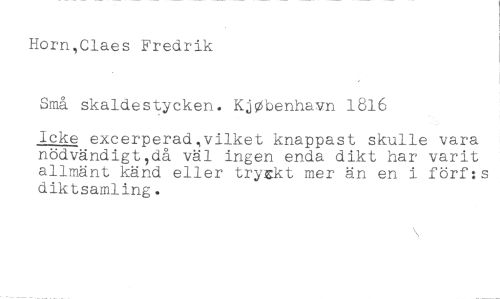 Horn,Claes Fredrik //// Små skaldestycken. KjObenhavn 1816 //// Icke excerperad,vilket knappast skulle vara nödvändigt,då väl ingen enda dikt har varit allmänt känd eller tryckt mer än en i förf:s diktsamling.