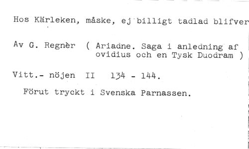 Hos Kärleken, måske, ej'billigt tadlad blifver //// Av G. Regngir ( Ariadne. Saga i anledning af ovidius och en Tysk Duodram ) //// Vitt.- nöjen II 134 - 144. //// Förut tryckt i Svenska Parnassen.