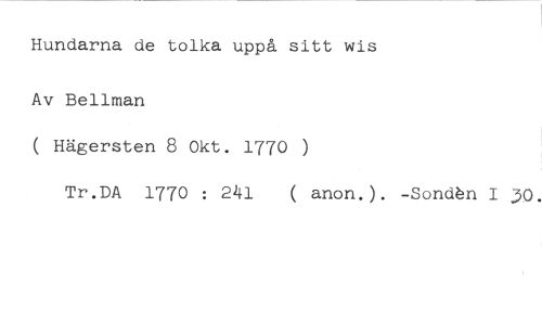 Hundarna de tolka uppå sitt wis //// Av Bellman //// ( Hägersten 8 Okt. 1770 ) //// Tr.DA 1770 : 241 ( anon.). -Sondån I 30.