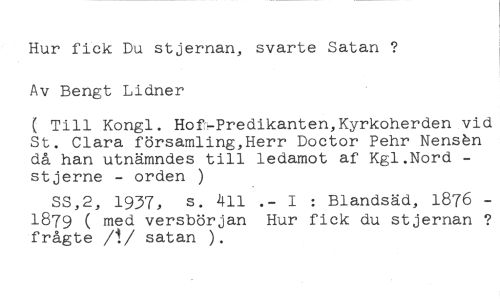 Hur fick Du stjernan, svarte Satan ? Av Bengt Lidner //// ( Till Kongl. Hof-Predikanten,Kyrkoherden vid St. Clara församling,Herr Doctor Pehr Nensbn då han utnämndes till ledamot af Kgl.Nord - stjerne - orden ) //// SS,2, 1937, s. 411 .- I : Blandsäd, 1876 1879 ( med versbörjan Hur fick du stjernan ? frågte /1/ satan ).