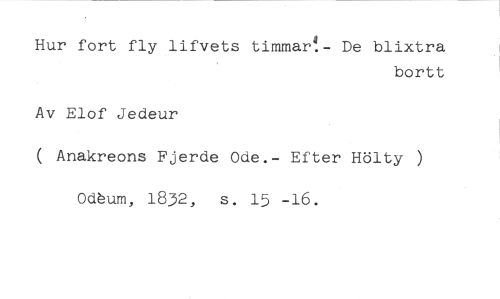 Hur fort fly lifvets timmar4.- De blixtra //// bortt //// Av Elof Jedeur //// ( Anakreons Fjerde Ode.- Efter Hölty ) Odhum, 1832, s. 15 -16.