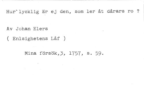 Hur'lycklig är ej den, som ler åt dårars ro ? //// Av Johan Elers //// ( Enlsighetens Låf ) //// Mina försök,3, 1757, s. 59.