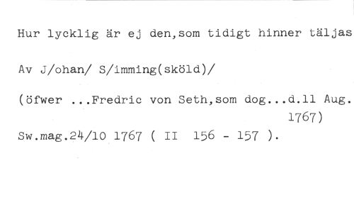 Hur lycklig är ej den,som tidigt hinner täljas Av J/ohan/ S/imming(sköld) //// /(öfwer ...Fredric von Seth,som dog. ..d.11 Aug. //// 1767) //// Sw.mag.24/10 1767 ( II 156 - 157 ).