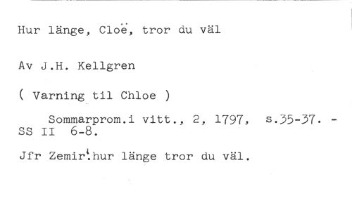 Hur länge, Cloe, tror du väl //// Av J.H. Kellgren //// ( Varning til Chloe ) //// Sommarprom.i vitt., 2, 1797, s.35-37. SS ii 6-8. //// Jfr Zemirthur länge tror du väl.