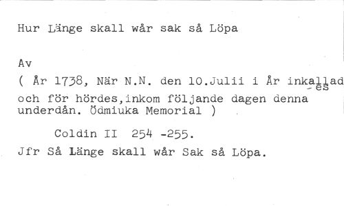 Hur Länge skall wår sak så Löpa //// Av //// ( År 1738, När N.N. den 10.julii i År inkaAlad //// och för hördes,inkom följande dagen denna underdån. ödmiuka Memorial ) //// Coldin II 254 -255. //// Jfr Så Länge skall wår Sak så Löpa.