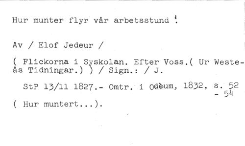 Hur munter flyr vår arbetsstund Av / Elof Jedeur //// /( Flickorna i Syskolan. Efter Voss.( Ur Westeås Tidningar.) ) / Sign.: / J. //// StP 13/11 1827.- Omtr. i ~m, 1832, s. 52 //// - 54 //// ( Hur muntert...).