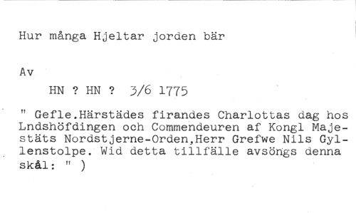 Hur många Hjeltar jorden bär //// Av //// HN ? HN ? 3/6 1775 //// " Gefle.Härstädes firandes Charlottas dag hos Lndshöfdingen och Commendeuren af Kongl Majestäts Nordstjerne-Orden,Herr Grefwe Nils Gyllenstolpe. Wid detta tillfälle avsöngs denna //// skål: " )