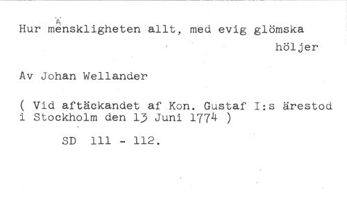 Hur menskligheten allt, med evig glömska //// höljer //// Av Johan Wellander //// ( Vid aftäckandet af Kon. Gustaf I:s ärestod i Stockholm den 13 Juni 1774 ) //// SD 111 - 112.