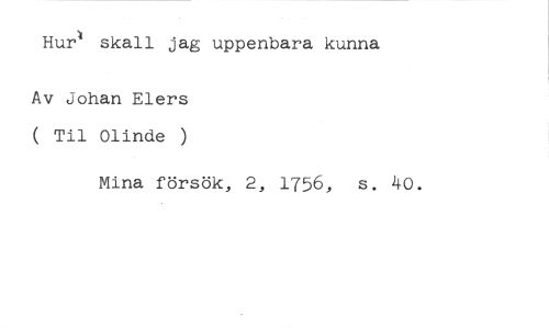 Hurl skall jag uppenbara kunna //// Av Johan Elers ( Til Olinde ) //// Mina försök, 2, 1756, s. 4o.