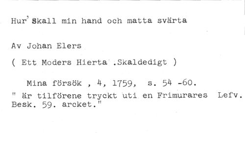 Hur' Skall min hand och matta svärta //// Av Johan Elers //// ( Ett Moders Hierta',Skaldedigt ) Mina försök , 4, 1759, s. 54 -60. //// " är tilförene tryckt uti en Frimurares Lefv. Besk. 59. arcket."