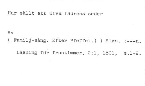 Hur sällt att öfva fädrens seder //// Av //// ( Familj-sång. Efter Pfeffel.) ) Sign. //// Läsning för fruntimmer, 2:1, 1801, s.1-2.