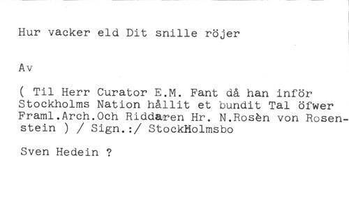 Hur vacker eld Dit snille röjer Av //// ( Til Herr Curator E.M. Fant då han inför Stockholms Nation hållit et bundit Tal öfwer Framl.Arch.Och Riddaren Hr. N.Roshn von Rosenstein ) / Sign.:/ StockHolmsbo //// Sven Hedein ?