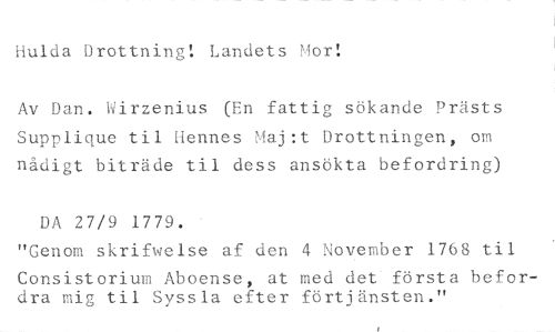 Hulda Drottning! Landets Mor! //// Av Dan. Wirzenius (En fattig sökande Prästs Supplique til Hennes Maj:t Drottningen, om nådigt biträde til dess ansökta befordring) //// DA 27/9 1779. //// "Genom skrifwelse af den 4 November 1768 til //// Consistorium Aboense, at med det första befordra mig til Syssla efter förtjänsten."