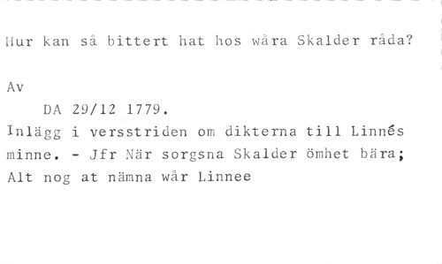 Hur kan så bittert hat hos wåra Skalder råda? //// Av //// DA 29/12 1779. //// Inlägg i versstriden om dikterna till Linnios minne. - Jfr När sorgsna Skalder ömhet bära; Alt nog at nämna wår Linnee