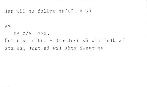Hur wil nu folket ha't? jo så //// Av //// DA 2/5 1770. //// Politisk dikt. - Jfr Just så wil folk af ära ha; Just så wil äkta Swear ha