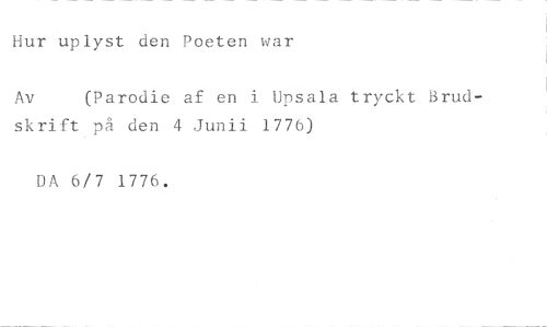 Hur uplyst den Poeten war //// Av (Parodie af en i Upsala tryckt Brud- //// skrift på den 4 Junii 1776) //// DA 6/7 1776.