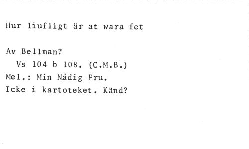 Hur liufligt är at wara fet //// Av Bellman? //// Vs 104 b 108. (C.M.B.) Mel.: Min Nådig Fru. //// Icke i kartoteket. Känd?